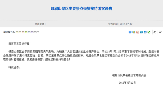 人民网成都7月13日电 (任重)据峨眉山风景名胜区管理委员会官网消息,峨眉山景区由于受前期强降雨天气影响,为确保广大游客朋友的生命财产安全,于2018年7月10日采取了临时管制措施,迅速对安全隐患开展了集中排查整治。目前,景区主要景点安全隐患已经排除,峨眉山风景名胜区管理委员会拟于2018年7月14日解除因排危采取的临时管制措施,恢复接待游客。