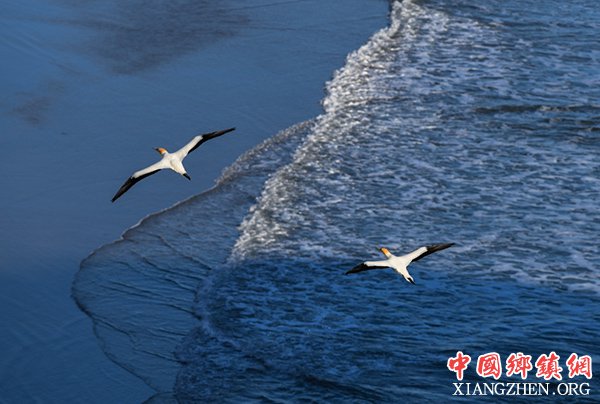 7月12日,在新西兰穆里怀海岸塘鹅栖息地,两只塘鹅飞过海岸。