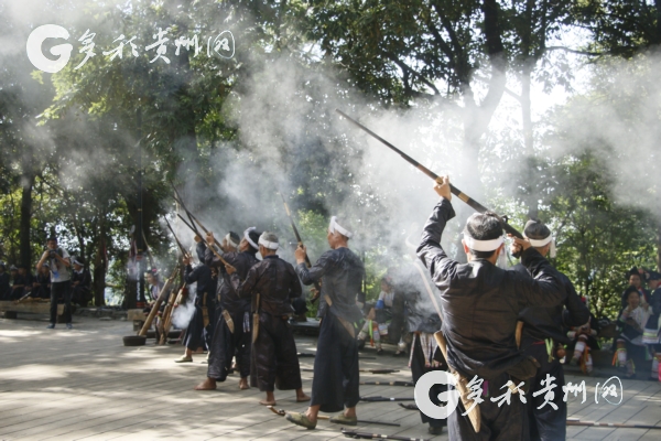 本届大会的媒体采访团刚抵达从江县丙妹镇岜沙苗寨,岜沙汉子们排排站列,拿着火枪对天“砰!砰!砰!”鸣放,以表达岜沙人打开寨门迎客。
