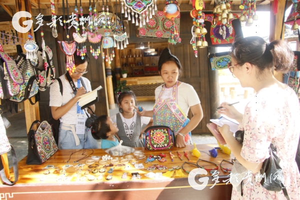 在苗寨旅游产品出售点,一个个写着“旅游扶贫摊位”字样的摊点吸引了记者的目光,只见摊位上整齐地摆放着当地特色小吃和各式各样的少数民族手工艺品。