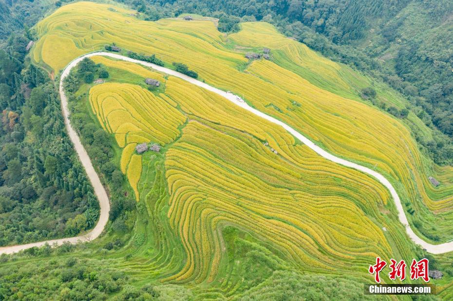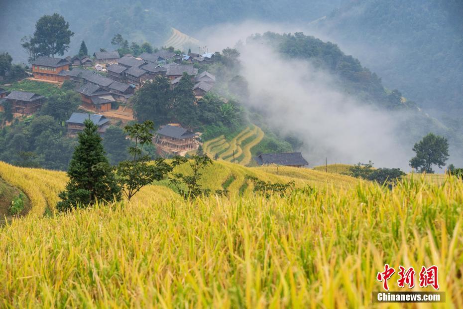 远眺贵州省榕江县阳开梯田秋色,金黄的水稻与苗寨相映成趣。 中新社记者 贺俊怡 摄