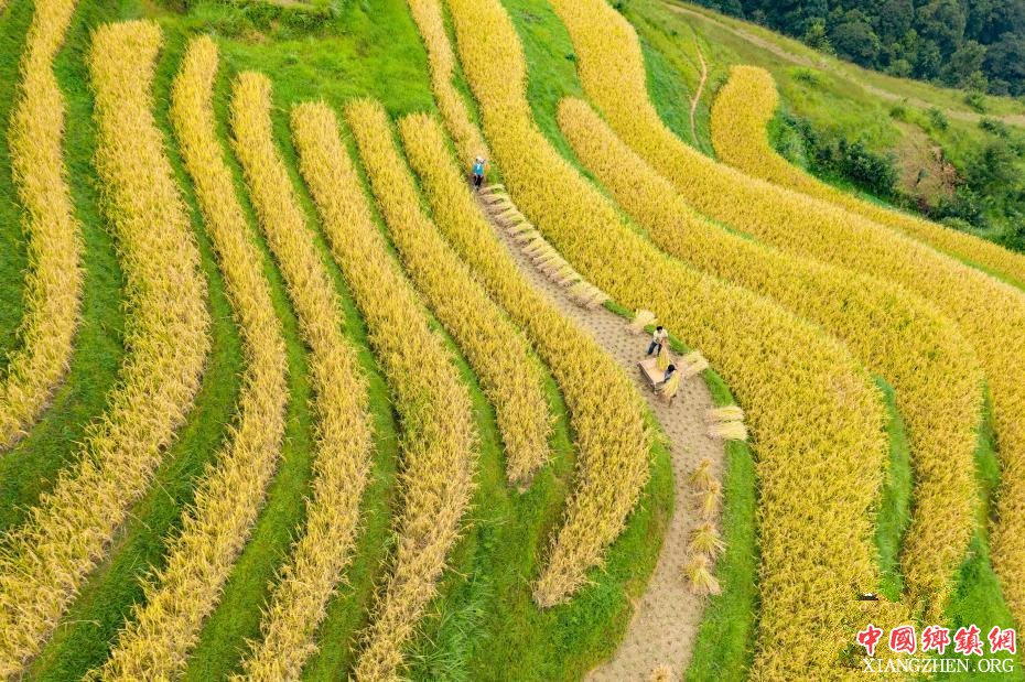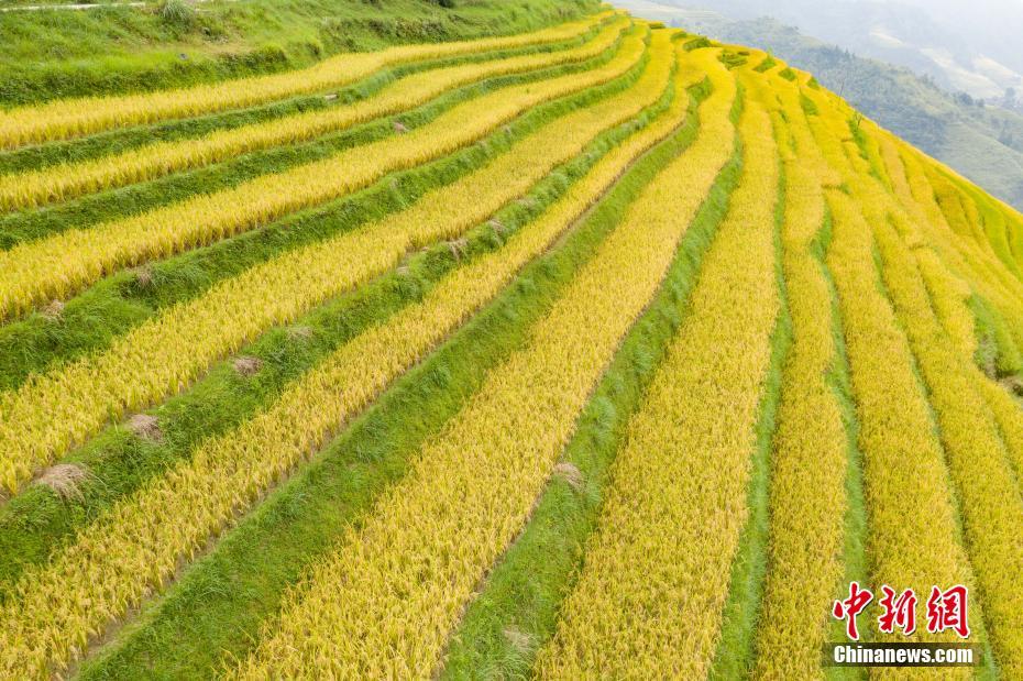9月11日,航拍贵州省榕江县阳开梯田秋色,农民在田间劳作。金秋时节,贵州省榕江县计划乡阳开梯田水稻进入成熟期,金黄色的梯田构成了一幅美丽的秋天图景。 中新社记者 贺俊怡 摄