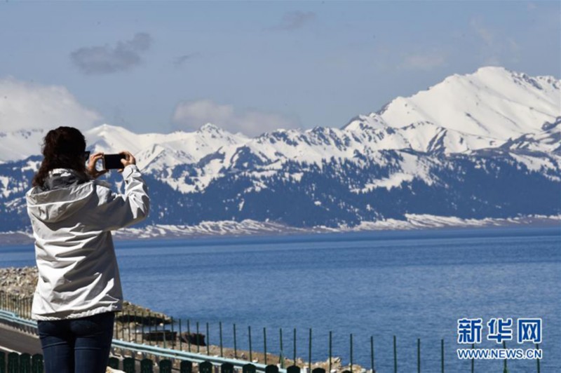 一名游客在拍摄赛里木湖。