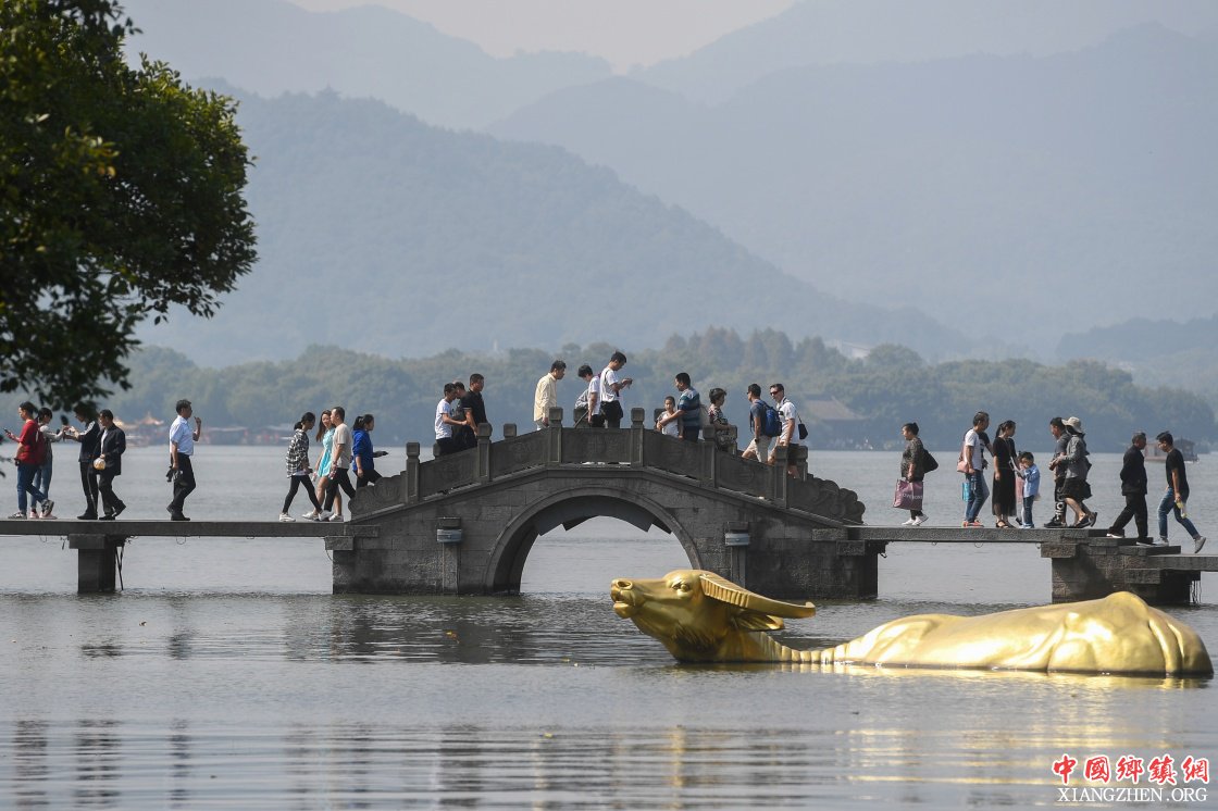 10月7日,游客在杭州西湖风景区涌金门游览。