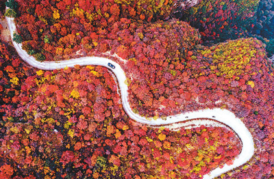 图为10月20日,车辆在邢台市沙河市柴关乡鸡冠山的旅游公路上行驶。