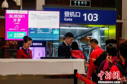 中新网成都10月23日电 (王鹏)10月23日凌晨,3U8391航班搭载222名旅客从成都双流国际机场起飞,标志着中国中西部首条直飞埃及的航线——成都直飞开罗航线正式开航。