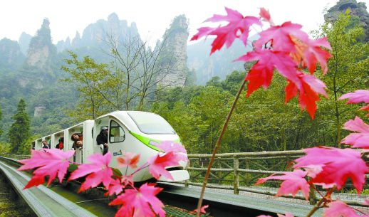 10月24日,游客在张家界武陵源风景区十里画廊游玩。金秋时节,该景区十里画廊红枫如火如霞,绚烂多彩,格外迷人。(吴勇兵 摄)