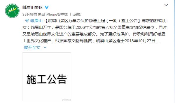 人民网成都10月27日电 (任重)据峨眉山旅游风景区微博27日消息,峨眉山风景名胜区管理委员会发布【峨眉山景区万年寺保护修缮工程(一期)施工公告】(下称“公告”)。公告称,峨眉山万年寺是国务院于2006年公布的第六批全国重点文物保护单位,同时又是峨眉山世界文化遗产的重要组成部分。为了更好地保护、传承和利用好峨眉山世界文化遗产,根据国家文物局批复,峨眉山景区定于2018年10月27日至2019年7月24日(270天)实施峨眉山万年寺保护修缮工程(一期),施工范围为巍峨宝殿和大雄宝殿。本次施工为局部封闭施工,弥勒殿、砖殿、贝叶楼、行愿楼等其余区域正常开放,寺院各项宗教活动正常开展。因工程施工给您带来的不便,敬请游客谅解。