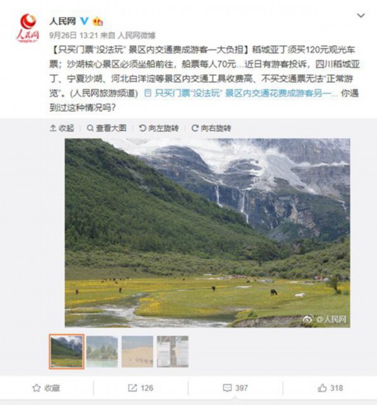 近日,人民网官方微博发布“只买门票‘没法玩’,景区内交通费成游客一大负担”的消息,引发网友热议。