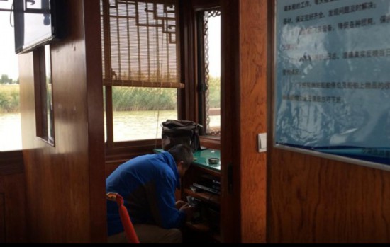 开船后20分钟的船程,工作人员一直在工作间玩手机。