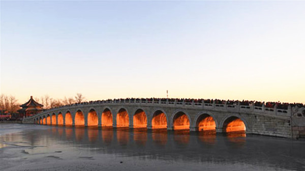 这是12月23日拍摄的颐和园十七孔桥“金光穿洞”美景。 当日,北京颐和园十七孔桥出现“金光穿洞”美景,吸引许多游客和摄影爱好者前来观赏拍摄。 新华社记者陈晔华摄
