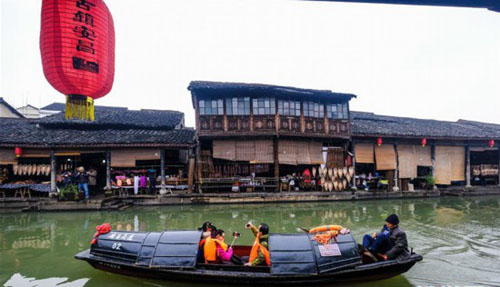 1月6日,游客乘坐传统乌篷船游览安昌古镇。