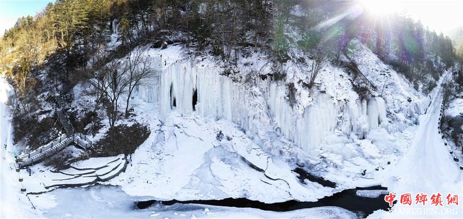 这是在吉林省长白县十五道沟望天鹅景区内拍摄的冰瀑景观(拼接照片,1月3日无人机拍摄)。