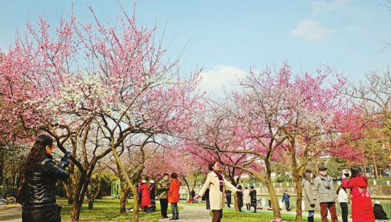 2月11日,游人在成都岁寒园的梅花树下拍照。记者 刘钧 摄