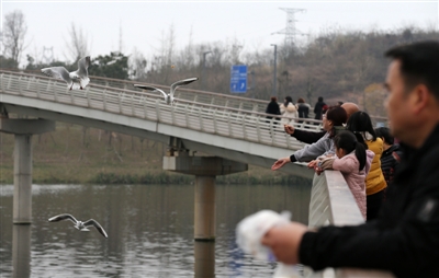 2019年春节,绿道、桥梁等设施完善的鹿溪河生态区,已经开始成为市民休闲、散步的去处。佘伟告诉记者,红嘴鸥属于一种亲人的鸟类,游人多了,它们自然也会组团过来,喜欢游人抛撒的面包等食物,“此次红嘴鸥栖息鹿溪河,连续数日与游客互动,也不难看出人们对野生动物的保护意识在加强。”