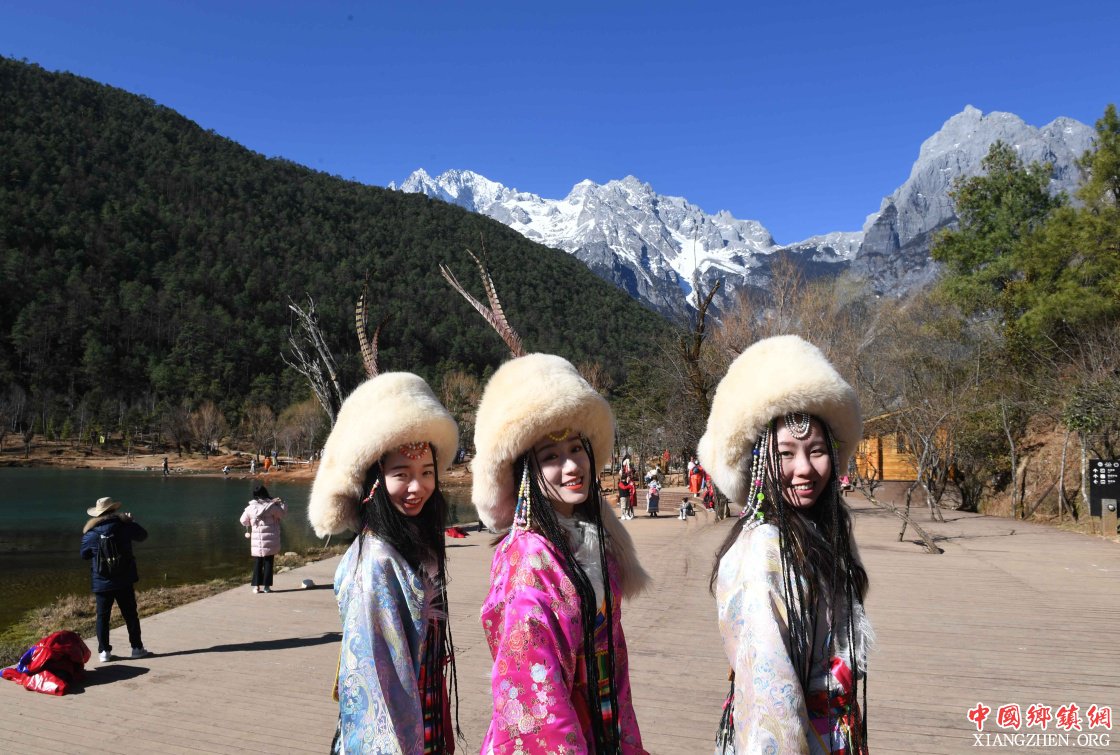 2月14日,游客在丽江玉龙雪山蓝月谷留影。