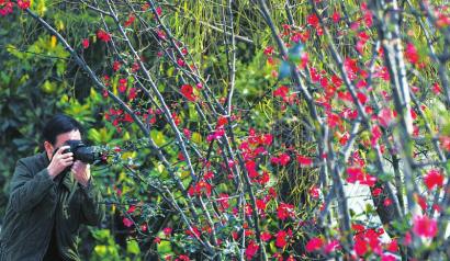 2月6日,摄影爱好者在成都锦江边拍摄盛开的海棠花。