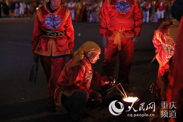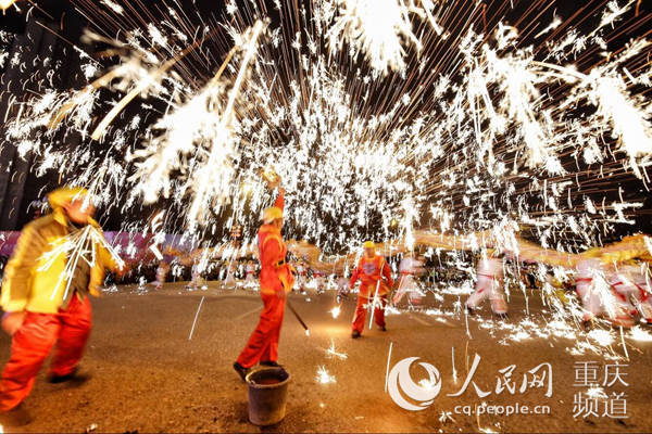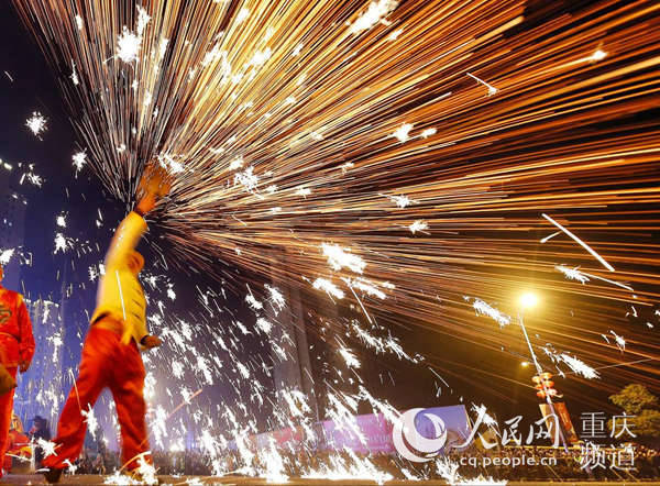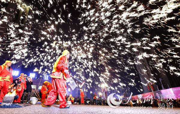 人民网重庆2月19日电 《延禧攻略》中乾隆帝与高贵妃共赏的铁水表演,你还记得吗?今晚元宵节,重庆市江津区白沙镇再现打铁水与民俗文化展演,现场逾万名市民争睹盛况,共度佳节。