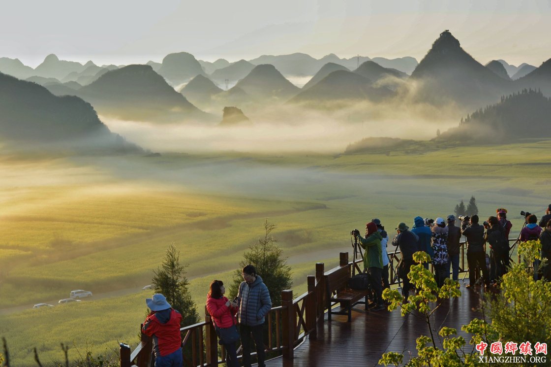 2月19日,游人在罗平县金鸡峰丛拍摄油菜花田日出景色。