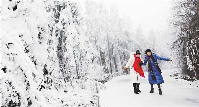 2月20日,游客在黔江区马喇镇灰千梁子赏雪。2月18日,当地出现雨雪天气,高山地区形成的冰挂、雾凇景观,吸引了不少游客观赏。