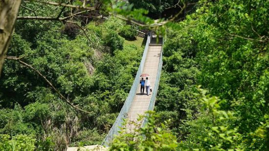 俗话说:“悬索桥上走一走,恩爱到白头。”若想增加一些乐趣,也可在桥上摇晃一二,在摇摇晃晃中观察这一河一桥,与大自然的风景相向成趣。但是,乐趣之外,也要提醒广大市民游客,出门游玩安全第一,在索桥上赏景时切勿打闹,严禁摇摆悬索桥边的扶手。