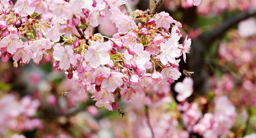 3月7日,蜜蜂在盛开的河津樱花丛中飞舞。当日,在上海植物园,春梅早樱竞相绽放,众多市民游客赏花踏青,享受春天的鸟语花香。新华社记者 方喆 摄