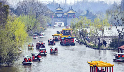 3月17日,游人在江苏扬州瘦西湖景区观光游览。 新华社发(刘江瑞 摄)