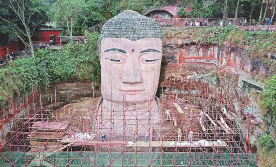 3月19日,乐山大佛头部的脚手架已开始拆除。乐山大佛胸腹部残损区域抢救性保护前期研究及勘测现场作业工作将于3月底全面完成,景区将于4月1日正式向游客重新开放。记者 何海洋 摄