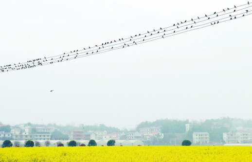 3月19日,涟源市桥头河镇珠璜村,许多小鸟在电线上休憩,似一串串跳动的音符。随着气温回升,大地春花绽放,群鸟曼舞,处处呈现一片生机勃勃的景象。张扬 摄
