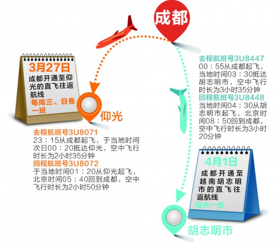 从蓉出发前往东南亚地区旅游更从容。昨日,四川航空正式对外宣布称,将于本月27日、4月1日分别新开通成都直飞缅甸仰光、越南胡志明市两条国际航线。这两条航线均为成都布局“48+14+30”国际航空客货运战略通道建设中的国际文旅航线,届时成都开通亚洲地区的国际文旅航线将达21条。