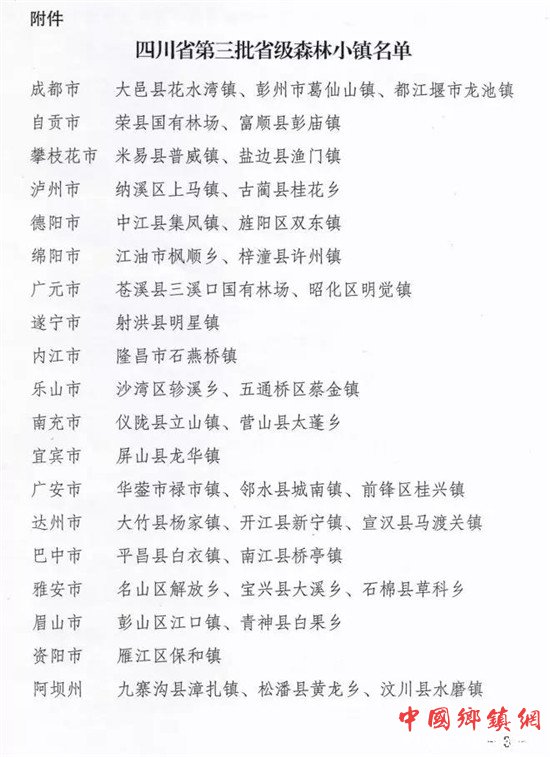 人民网成都3月29日电 (任重)综合四川省生态旅游网官微消息,3月25日,四川省绿化委员会和四川省林业和草原局联合发布《关于授予大邑县花水湾镇等48个乡镇(林场)为第三批省级森林小镇的通知》,正式发布了四川省第三批省级森林小镇名单。