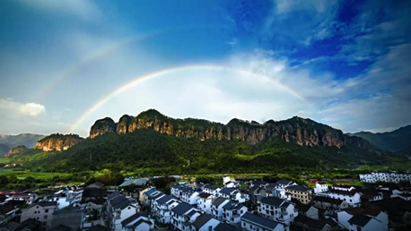 始丰溪从村前流过,“十里铁甲龙”如一道青色的屏障横亘田间,三面青山环抱,如同一个真实的“世外桃源”。“十里铁甲龙”蜿蜒十里的峭壁犹如天然屏嶂,气势恢宏,秀奇磅礴,如屏如画,极具视觉冲击感,是国家级风景名胜区。