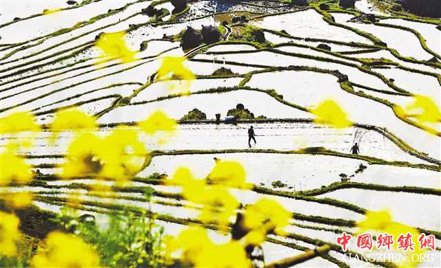 4月6日,酉阳土家族苗族自治县花田乡何家岩村,村民正在如画的梯田中平整秧地。