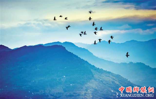 傍晚时分,綦江区万兴山,归巢的鸟儿在空中飞翔。