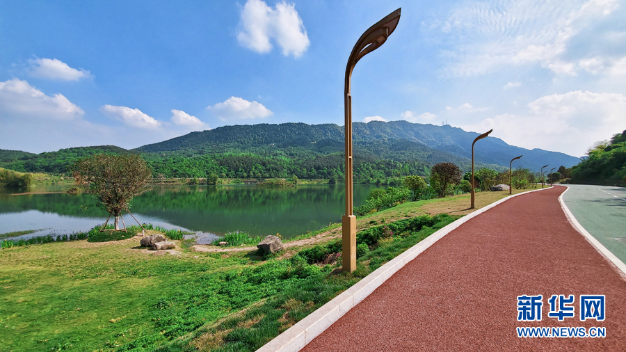 春日里,大束阳光倾洒而下,玄天湖绿道仿若一条彩带,飘扬在湖岸。新华网发(刘磊 摄)