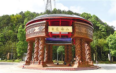 据了解,南大门总高度10.1米,其中大门柱高5.5米,外圈直径18米,顶部采用传统木结构斜顶,表面为朱红底漆,覆盖筒瓦。另外,该建筑朝向3个路口开口,开口处均悬挂一块“自在南山”金字牌匾,从广黔路、福寿路、黄金公路三个方向都能一览大门恢弘的全貌。值得一提的是,南大门的夜景灯饰采用暖色系灯光,光源层次丰富。南大门设在南山火锅一条街、九街壹华里等景点的必经之地,为南山风景区新增一道亮丽风景线。南大门包含着哪些寓意呢?南山生态带管委会相关负责人告诉记者:“南大门的圆形大门设计象征着团圆,寓意亲朋欢聚一堂。”