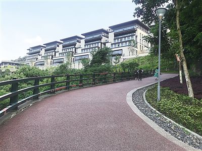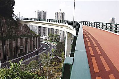 观光道路面铺装红色塑胶颗粒,像一条长龙蜿蜒在翠绿山间。站在观光道上,脚下是嘉陵江和化龙桥一带的高楼大厦,对岸的鸿恩寺和在建的红岩村大桥仿佛就在咫尺之间。