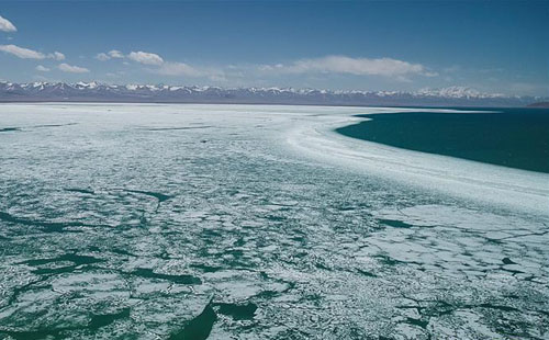 5月8日无人机拍摄的西藏纳木错开湖画面。 随着气温升高,西藏纳木错解冻开湖,迎接即将到来的旅游旺季。 新华社记者 普布扎西摄