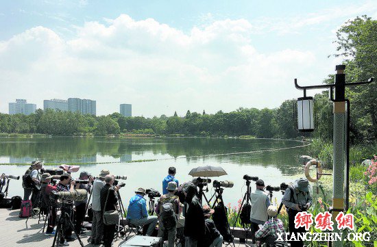 前来浣花溪公园拍鸟的摄影爱好者打堆堆
