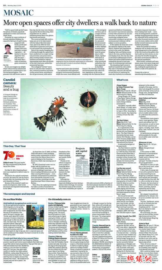 《中国日报》刊登成都市新津县兴义镇兴义绿道旁的一居民小区内戴胜鸟喂食的图片新闻
