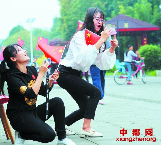 2019年国庆,成都各大景点到处悬挂着五星红旗,人们手中挥舞着国旗,甚至脸上也贴上国旗的图案,成都市民早已将爱国的情怀深植内心。图为国庆期间,两位年轻人用手机记录下成都国庆期间的精彩瞬间。 记者 张全能 摄影报道