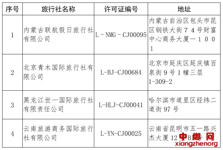 根据《旅行社条例》和《中国公民出国旅游管理办法》,自2019年11月7日起,注销以下4家旅行社的旅行社业务: