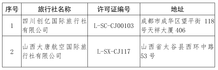 根据《旅行社条例》和《中国公民出国旅游管理办法》,自2019年11月7日起,取消以下2家旅行社的经营出境旅游业务: