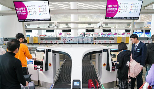 1月15日,旅客在深圳机场出发大厅体验自助行李托运。
