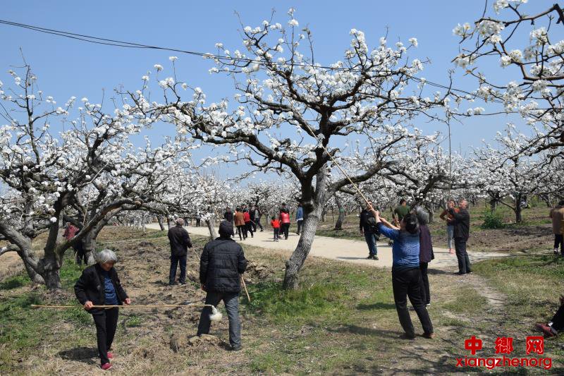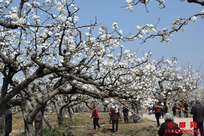 中乡网安徽讯 日前,在安徽省亳州市谯城区龙扬镇苏赵梨园里,千树万树梨花开,走入梨园,枝头上一片银白色,树干苍郁,花朵莹润,花瓣白如凝脂,吸引了众多游客,流连忘返。果园里,10多名果农正在为梨树授粉。由于今年气温偏高,梨花比往年开得早。