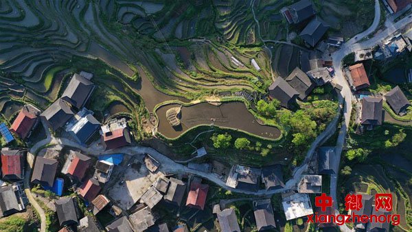 这是融水苗族自治县杆洞乡小河村高羽苗寨的木楼和梯田(3月31日摄,无人机照片)。 随着气温逐渐转暖,广西融水苗族自治县杆洞乡的苗寨梯田景色迷人,美如画卷。 新华社记者 黄孝邦 摄