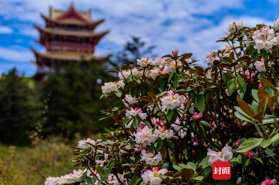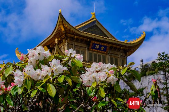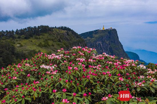每年的5月到6月,是峨眉山高山杜鹃花开繁盛的季节。5月23日,封面新闻记者来到峨眉山景区看到,在金顶的整个游山道两旁,以及摄身崖旁,各色杜鹃花在阳光下次第绽放,一朵朵、一簇簇、一片片,美上云端。