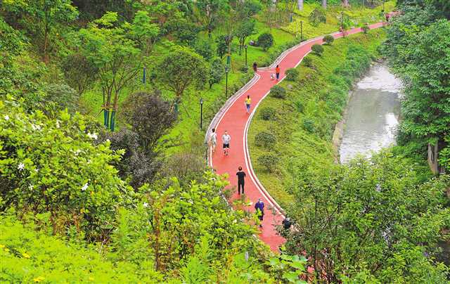 5月24日,市民在新建成的沙坪坝渝碚路清水溪休闲湿地公园健身散步玩耍。据了解,此前这里是一片荒坡和一条臭水沟。去年10月,渝碚路街道对该片区进行改造,占地4.2万平方米、植被丰富、水清岸绿的清水溪休闲湿地公园于今年5月初建成并对市民开放,给附近多个小区的居民提供了一个健身休闲、观光游玩的好去处。