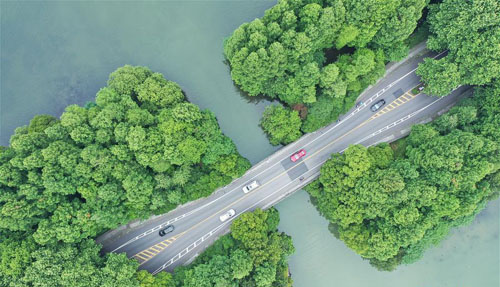 5月27日,车辆行驶在西湖杨公堤上(无人机照片)。 随着气温升高,杭州西湖绿意葱茏,展现出柔美的湖光山色。 新华社记者翁忻旸摄