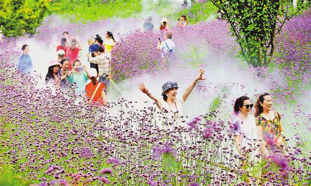 5月27日,两江新区礼嘉智慧公园,市民在紫色马鞭草花海中游玩、拍照。